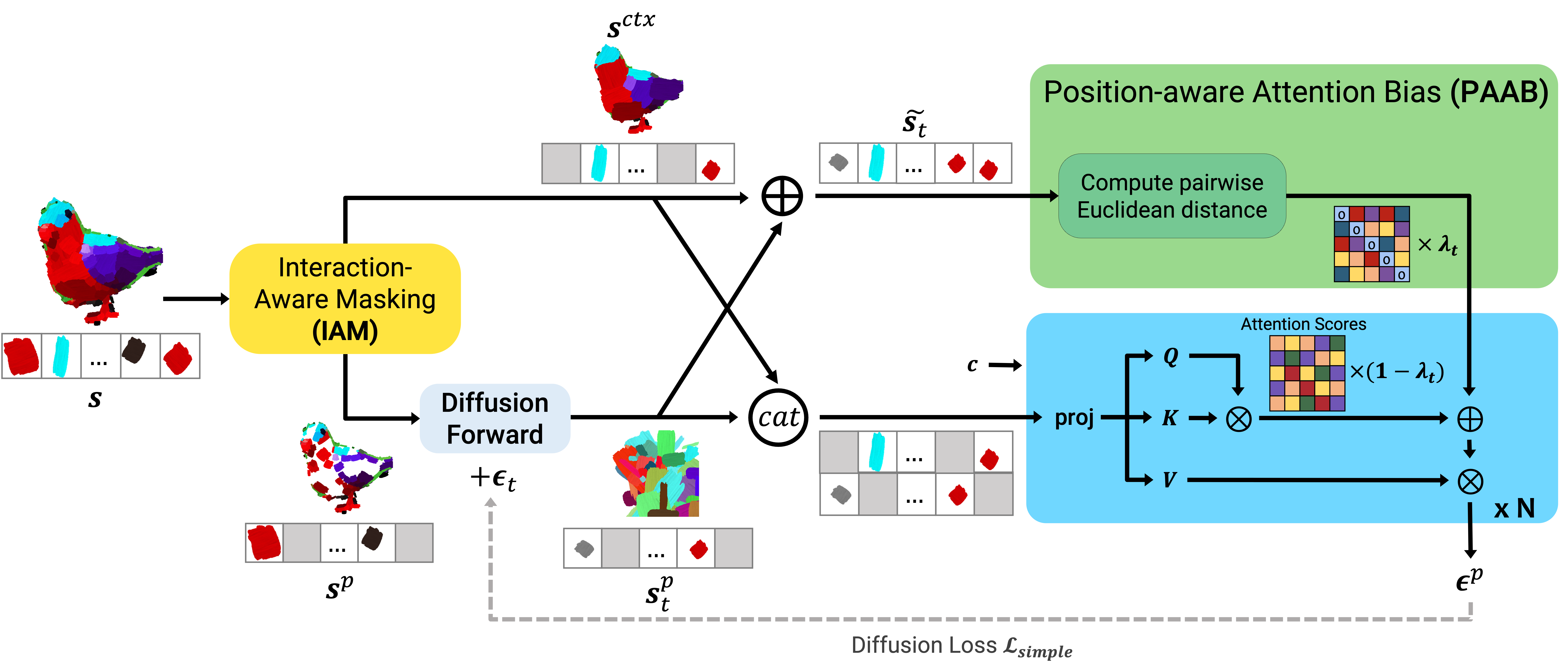 Given an input sequence s, the Interaction-Aware Masking block divides the sequence in two, a conditioning sequence sctx which acts as context to denoise the missing strokes sp that, using a diffusion framework, are noised to spt. Our Position- aware Attention Bias modifies the attention scores of our Transformer based on the Euclidean distance between the conditioning and noised strokes.