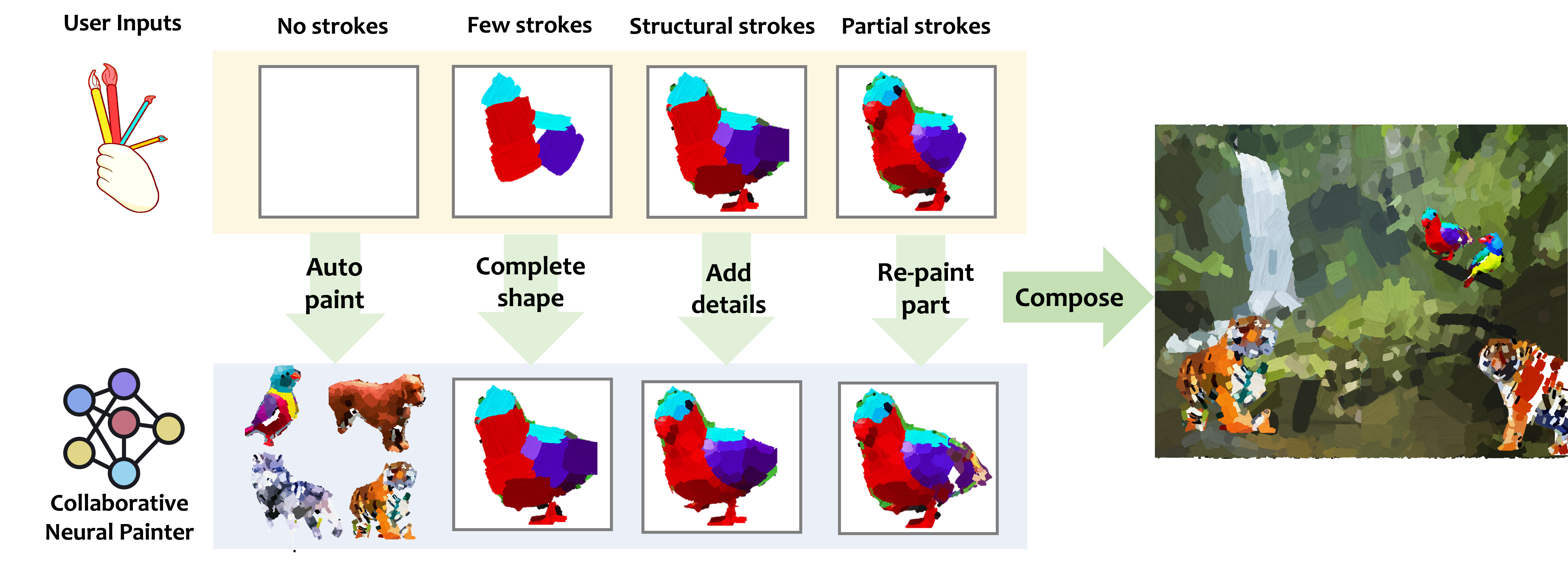 The process of painting fosters creativity and rational planning. However, existing generative AI mostly focuses on producing visually pleasant artworks, without emphasizing the painting process. We introduce a novel task, Collaborative Neural Painting (CNP), to facilitate collaborative art painting generation between humans and machines. Given any number of user-input brushstrokes as the context or just the desired object class, CNP should produce a sequence of strokes supporting the completion of a coherent painting. Importantly, the process can be gradual and iterative, so allowing users' modifications at any phase until the completion. Moreover, we propose to solve this task using a painting representation based on a sequence of parametrized strokes, which makes it easy both editing and composition operations. These parametrized strokes are processed by a Transformer-based architecture with a novel attention mechanism to model the relationship between the input strokes and the strokes to complete. We also propose a new masking scheme to reflect the interactive nature of CNP and adopt diffusion models as the basic learning process for its effectiveness and diversity in the generative field. Finally, to develop and validate methods on the novel task, we introduce a new dataset of painted objects and an evaluation protocol to benchmark CNP both quantitatively and qualitatively. We demonstrate the effectiveness of our approach and the potential of the CNP task as a promising avenue for future research.